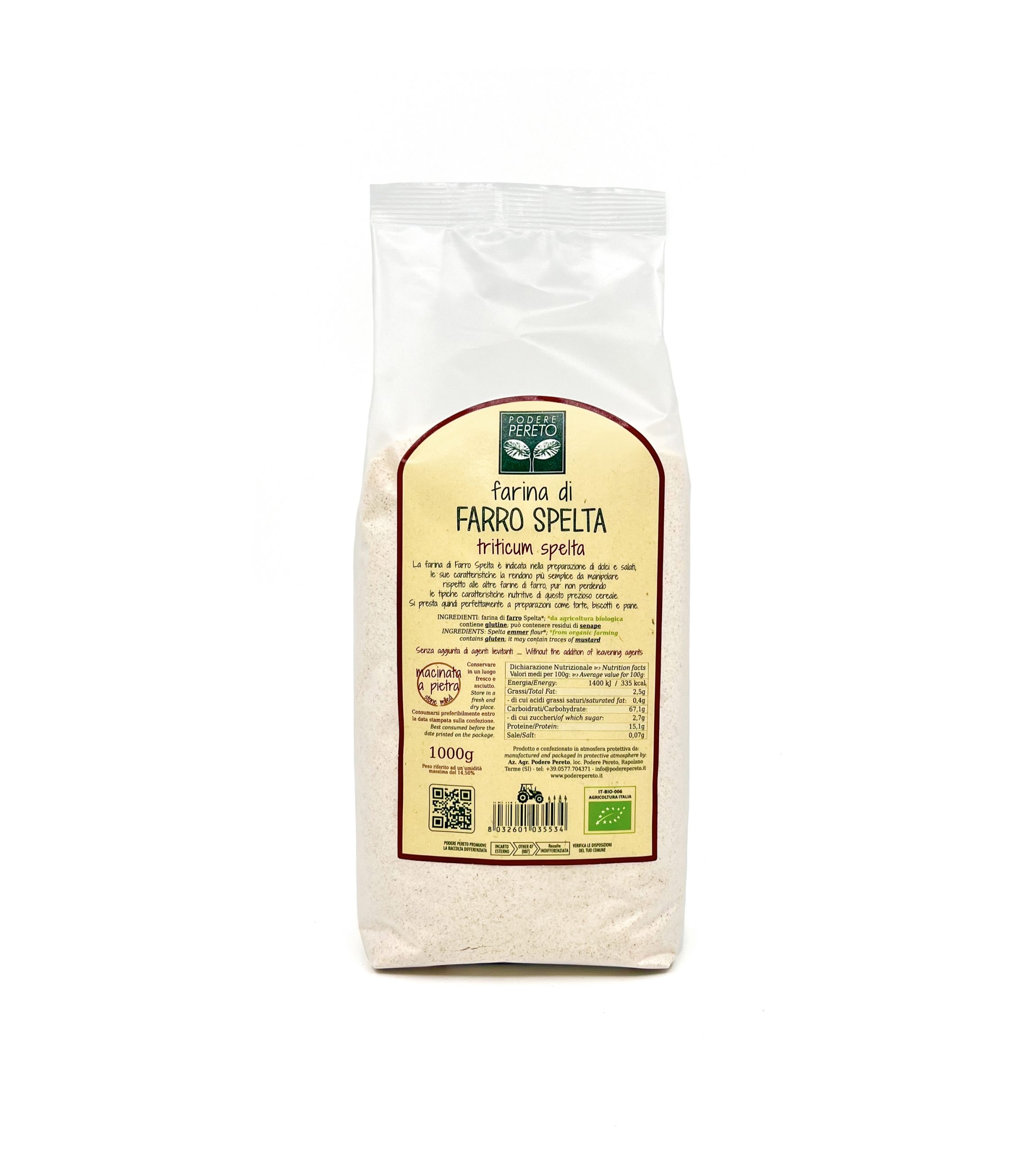 La nostra farina biologica di Farro Spelta è macinata a pietra, per ottenere una farina semintegrale di tipo 1. È una farina di solo grano, senza alcuna aggiunta di agenti lievitanti, addensanti o miglioratori tecnologici.